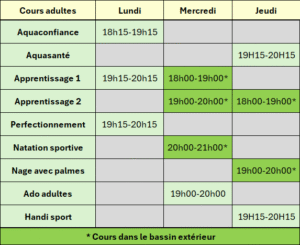 Tous les cours adultes durent 1 heure.